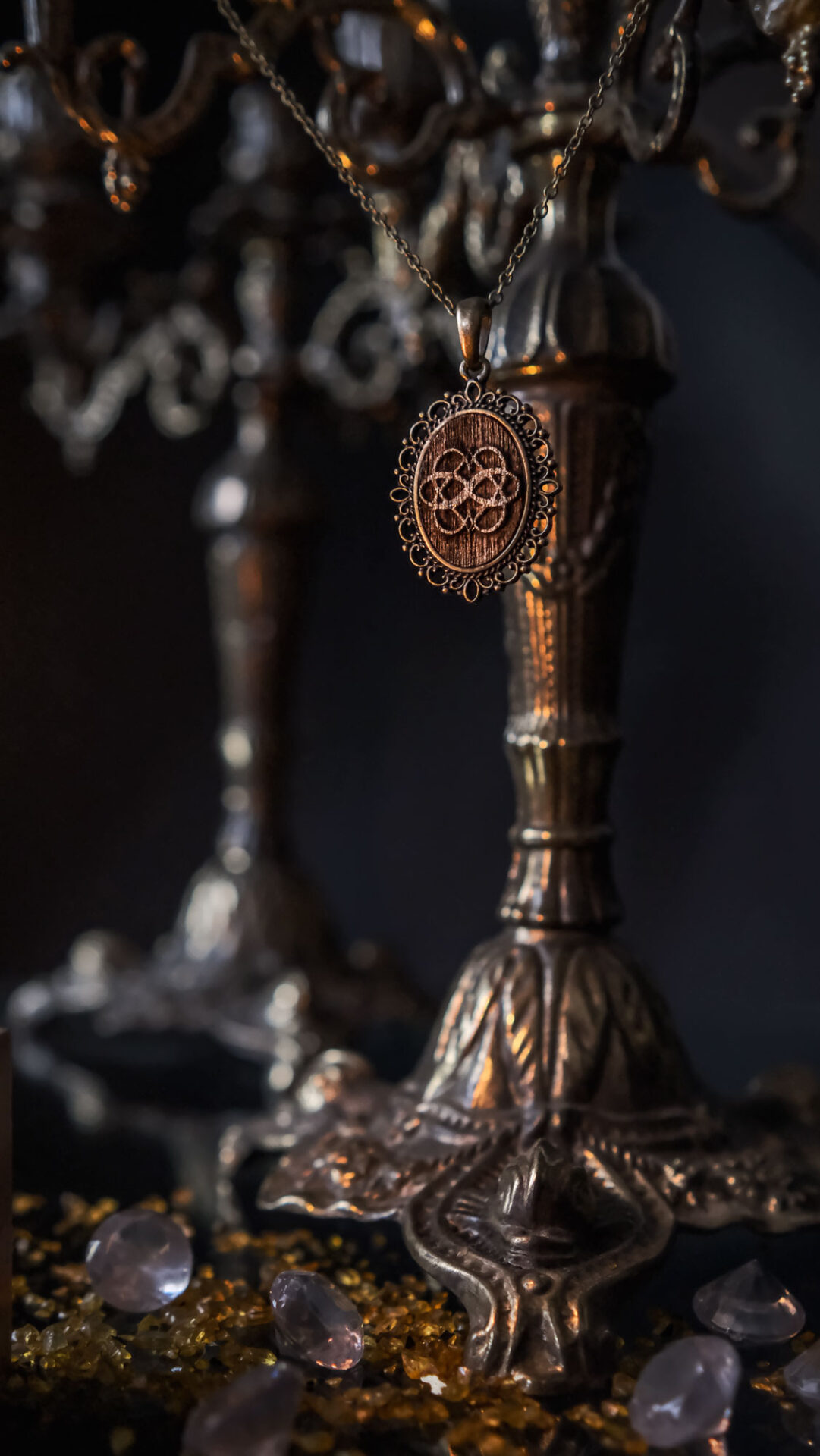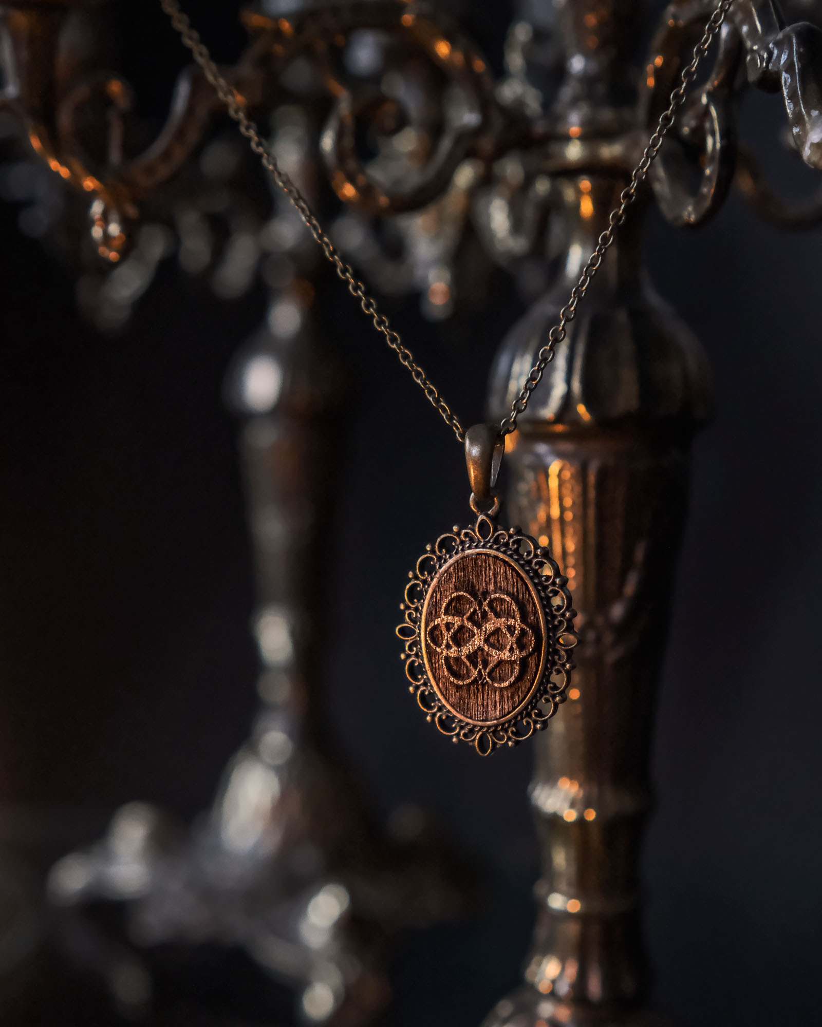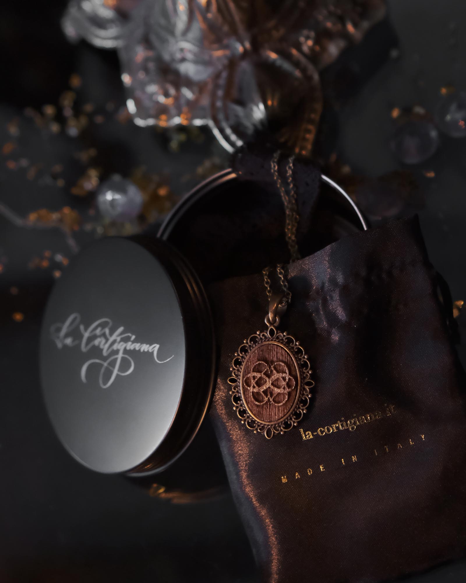 Più che un gioiello, questo pezzo è una dichiarazione di connessione oltre le convenzioni. Realizzato a mano con materiali caldi legno di noce e incorniciato in modo dettagliato montatura barocca in bronzo, il ciondolo celebra non monogamia etica, relazioni poliamorosee la bellezza di molteplici storie d'amore.