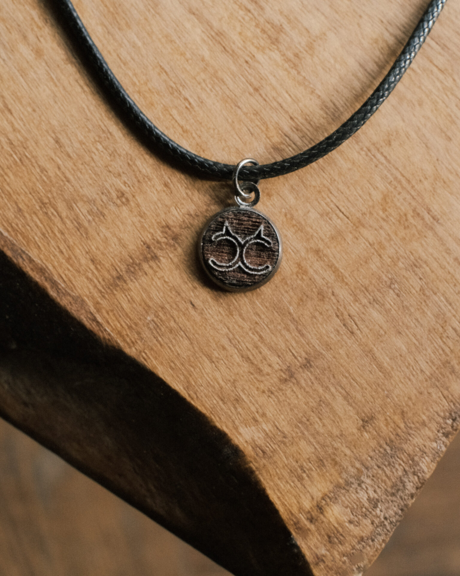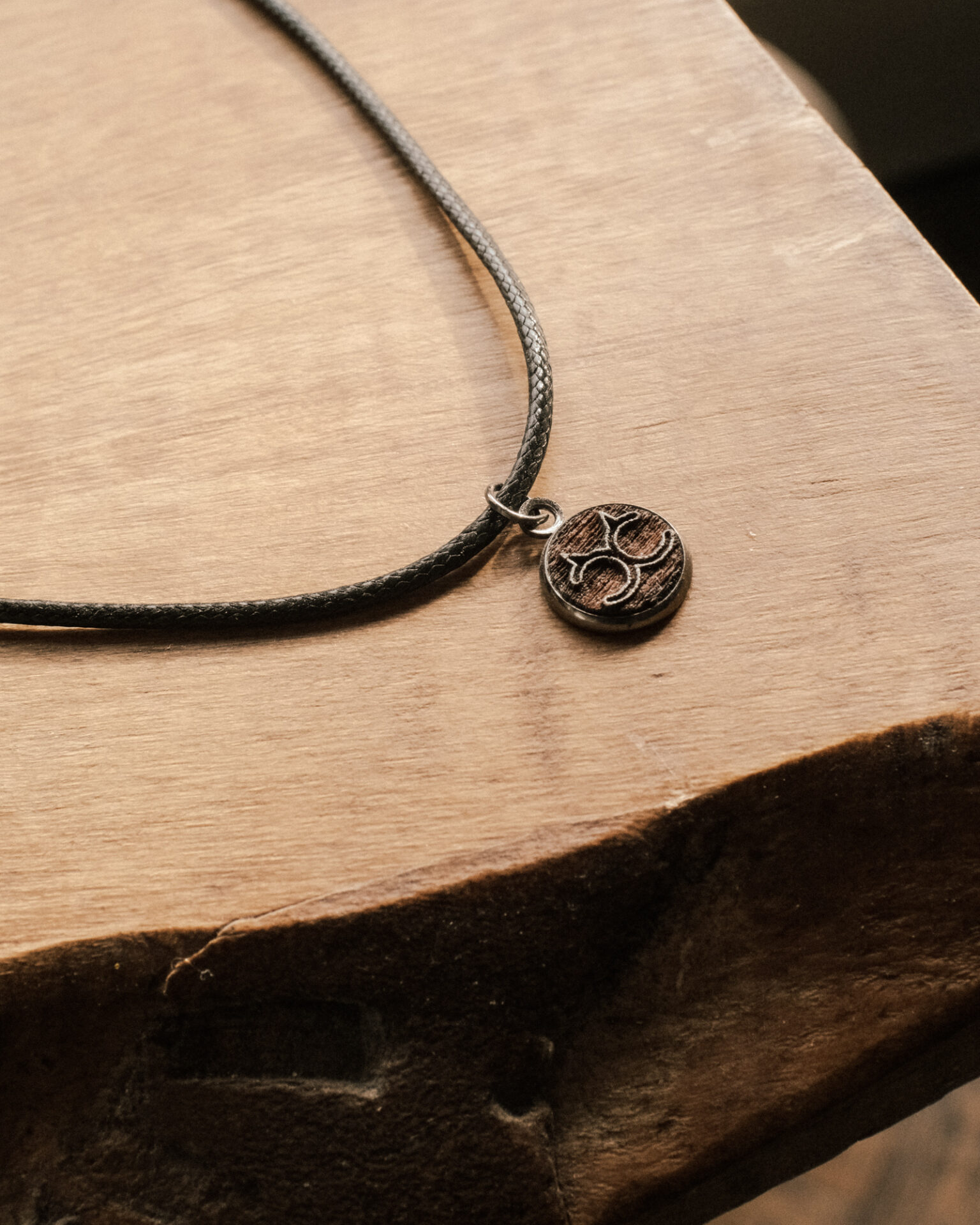 A discreet cuckold symbol pendant with natural walnut wood inlay.