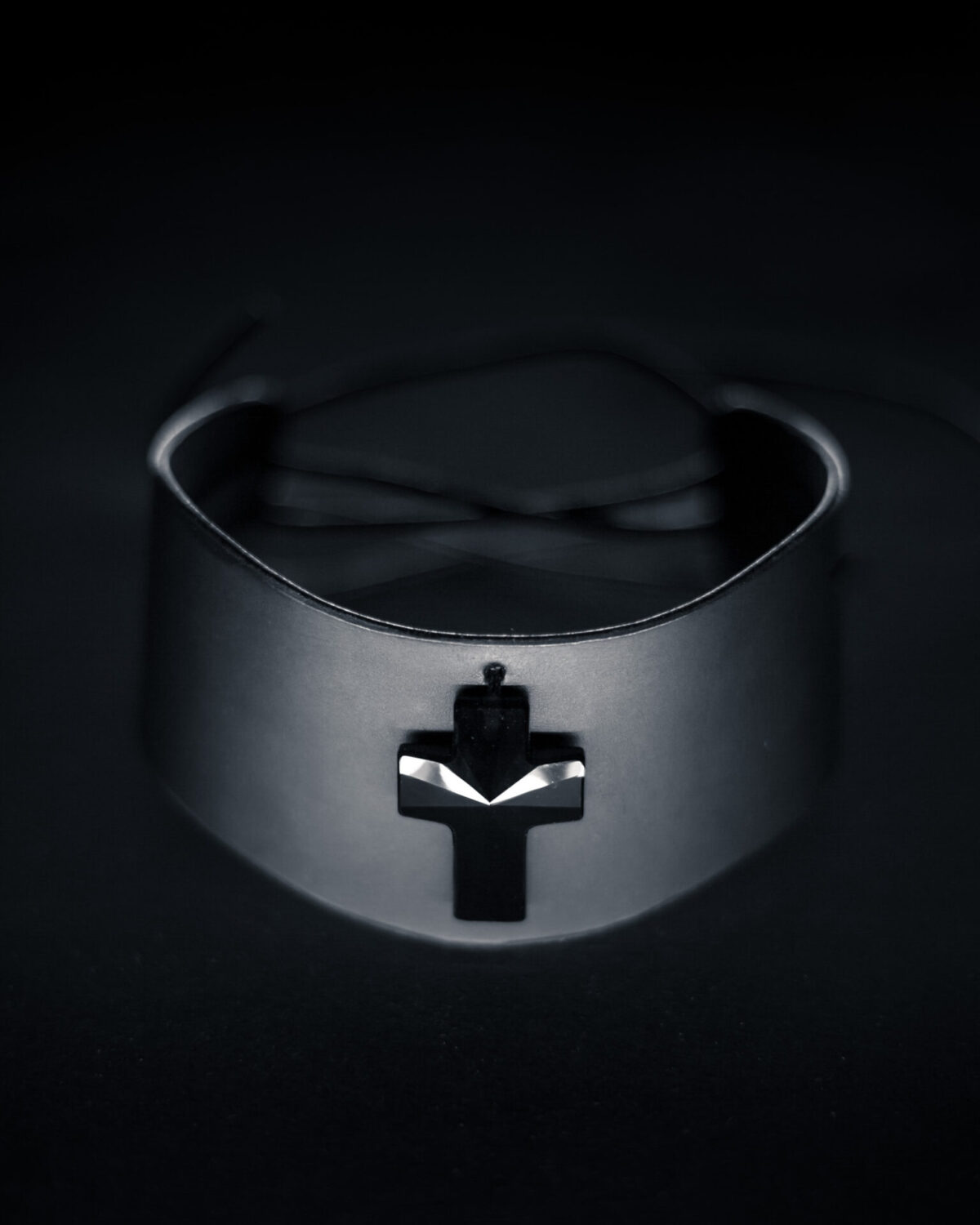 A handcrafted Italian leather choker shaped to the neck’s contours, featuring a radiant Swarovski crystal cross — elegant, bold, and deeply symbolic.