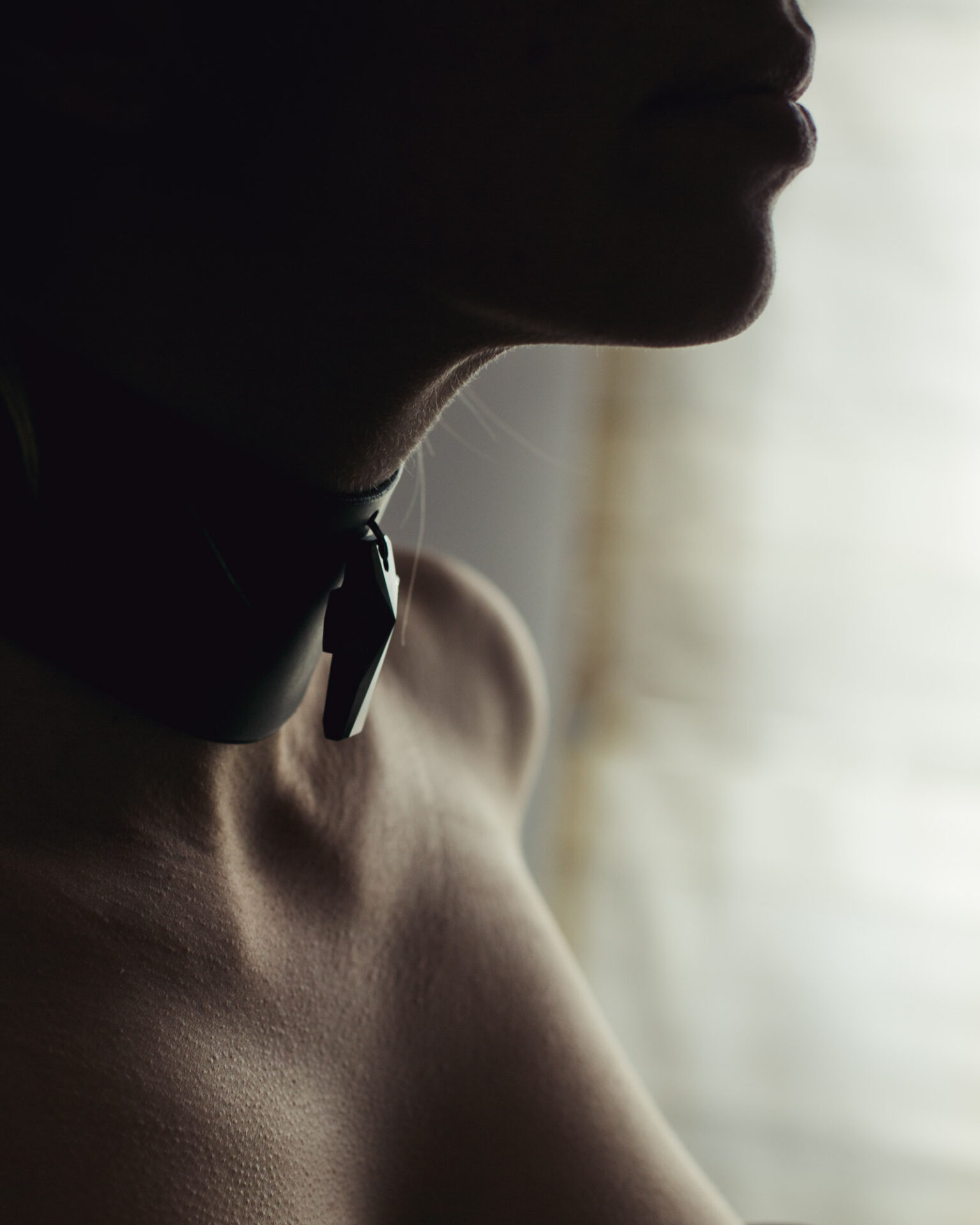 This piece is more than an accessory — it’s a statement that lives against the skin. Handcrafted from smooth, high-quality Italian leather, the choker is sculpted to follow the natural curve of the neck, its form both refined and deliberate. A lace-up closure at the back ensures a precise, comfortable fit, turning craftsmanship into intimacy.