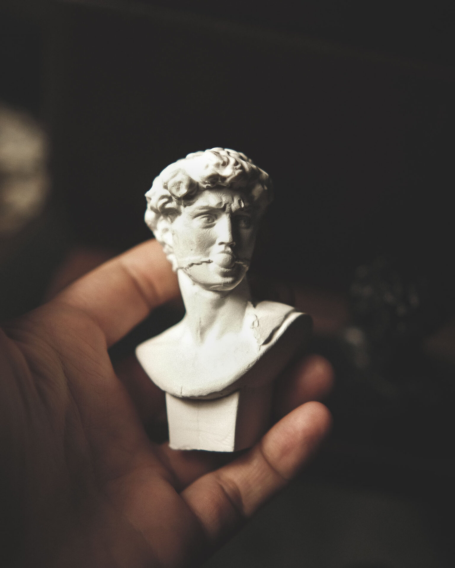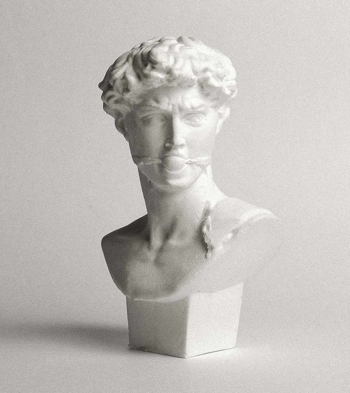 This plaster sculpture reinterprets David through a restrained intervention, transforming an iconic figure into a quiet, intimate object.