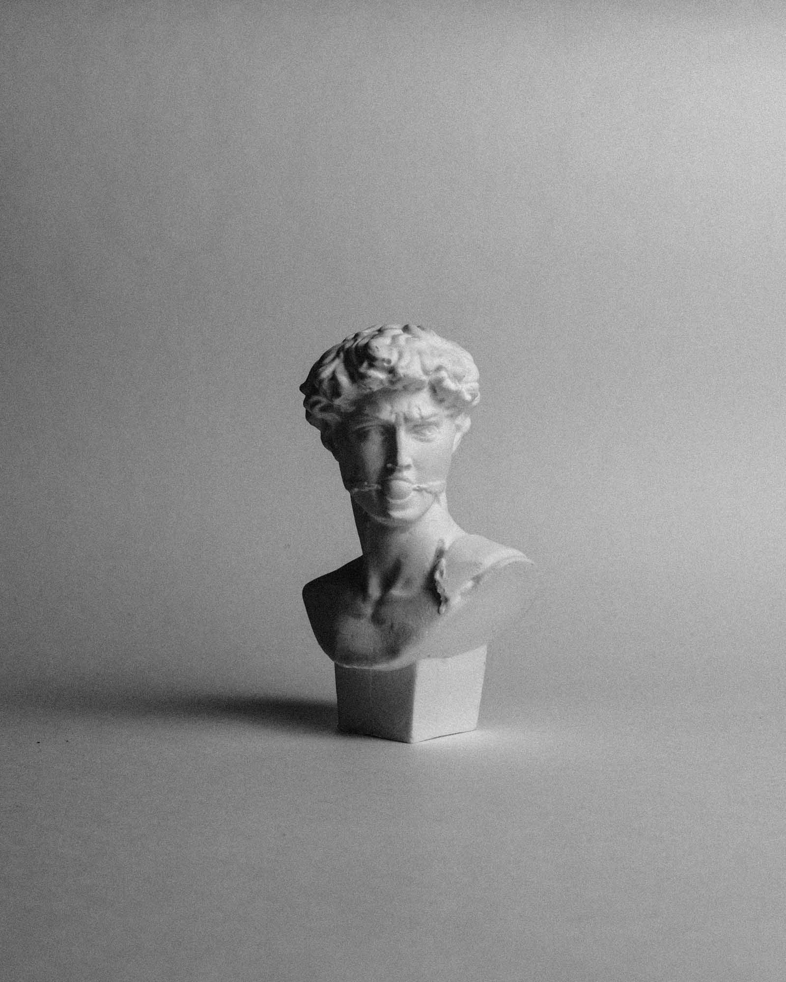 Cast in plaster, the figure reinterprets David at a reduced scale, shifting the work from monumentality to intimacy. A minimal yet decisive alteration introduces the theme of silence – not as absence, but as a deliberate state.