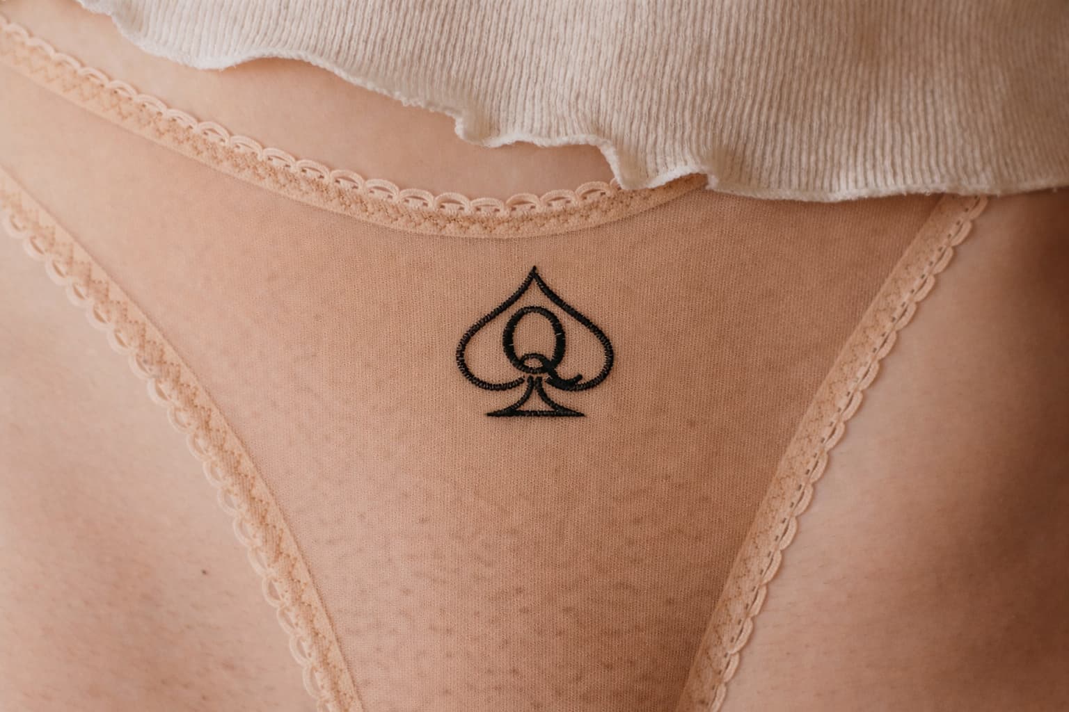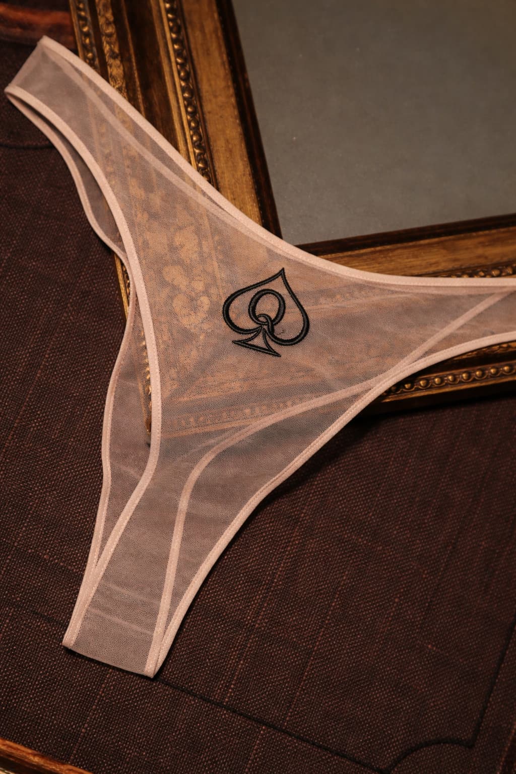 Sheer invisible mesh panties with a minimalist QOS “Queen of Spades” embroidery in black thread. Designed without a gusset for an uninterrupted, intentional line. Lightweight, breathable, and handmade for those who appreciate symbolic lingerie and refined erotic detail.