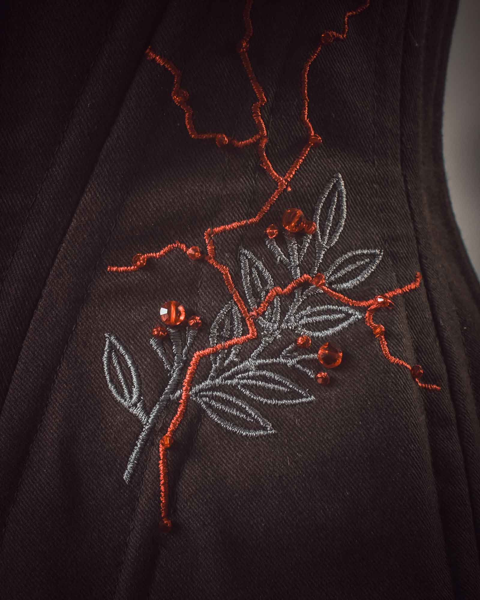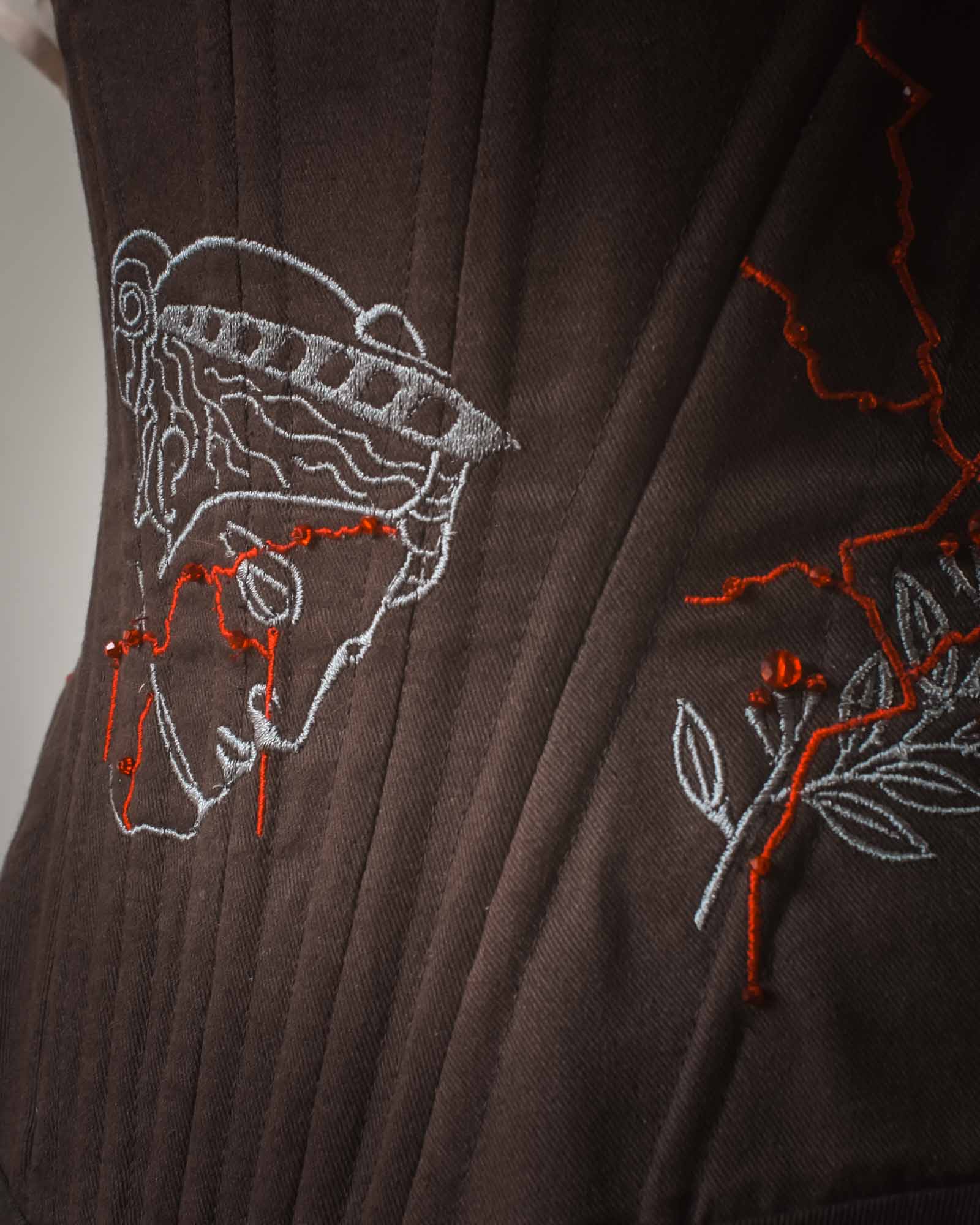 Embroidered on the corset is the head of an antique statue – a symbol of this connection.