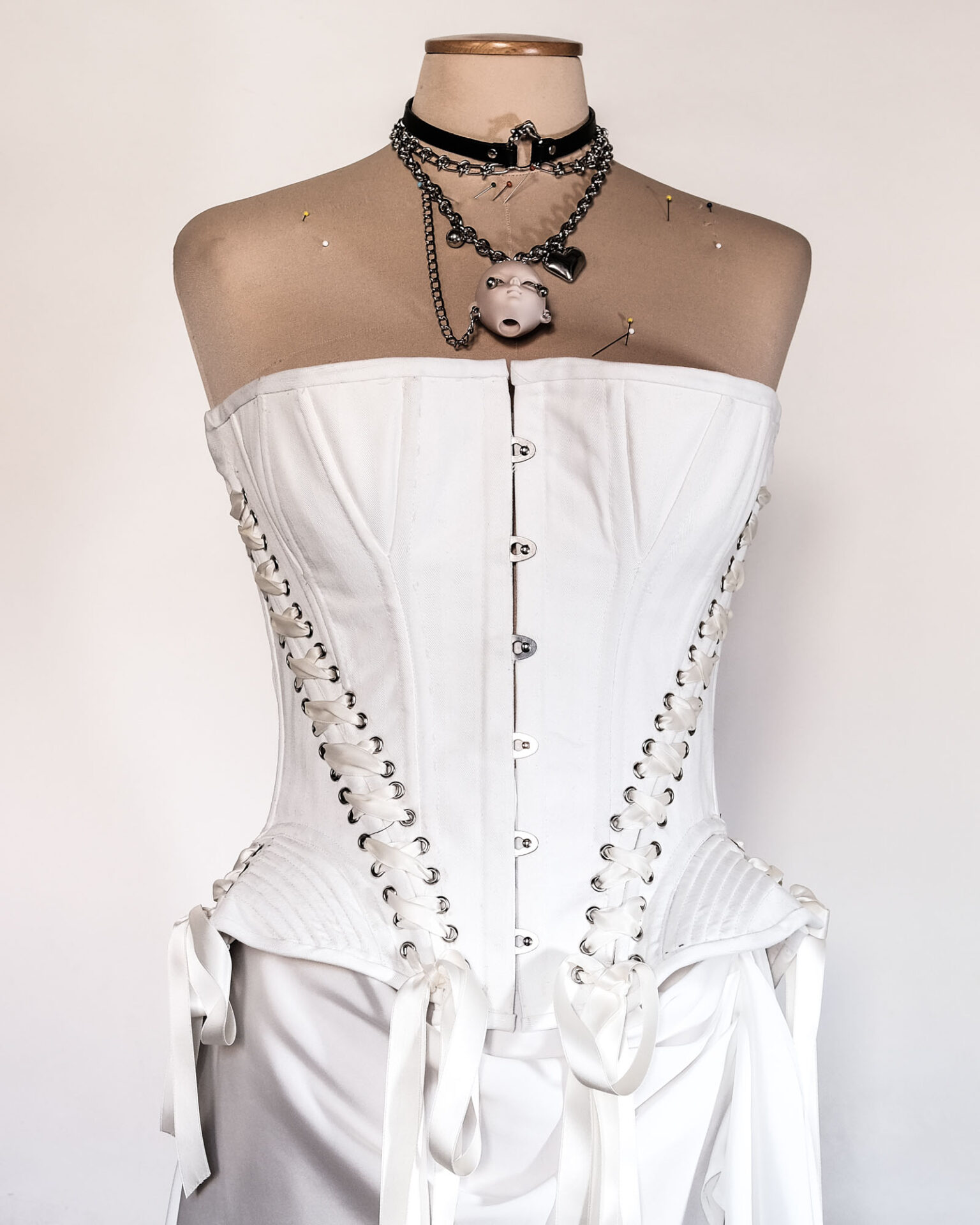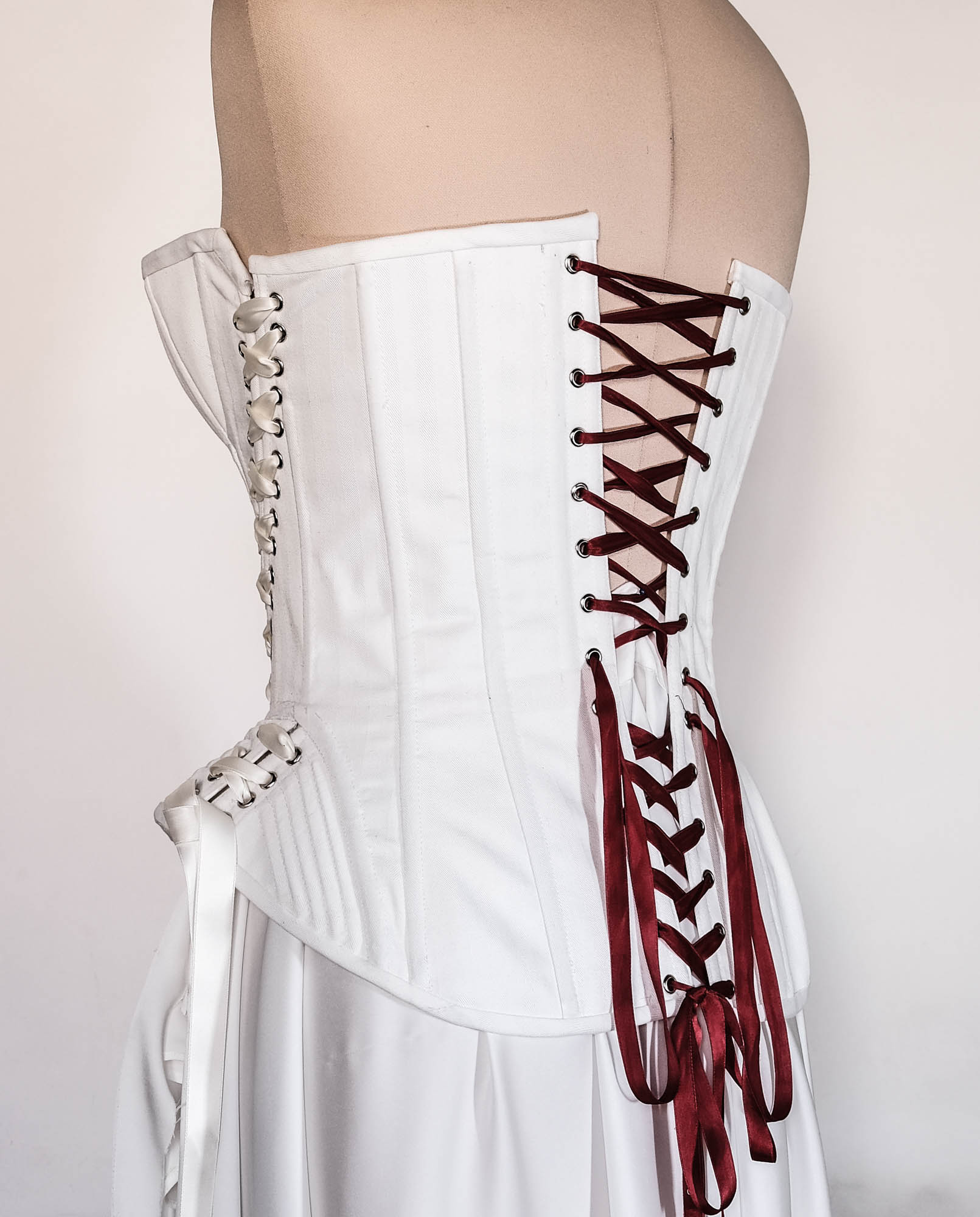 Meticulously handmade from high-quality cotton twill, this corset is structured, breathable, and designed to embrace your curves without compromising flexibility. Its double side-lacing and front busk closure offer both adjustability and visual impact.