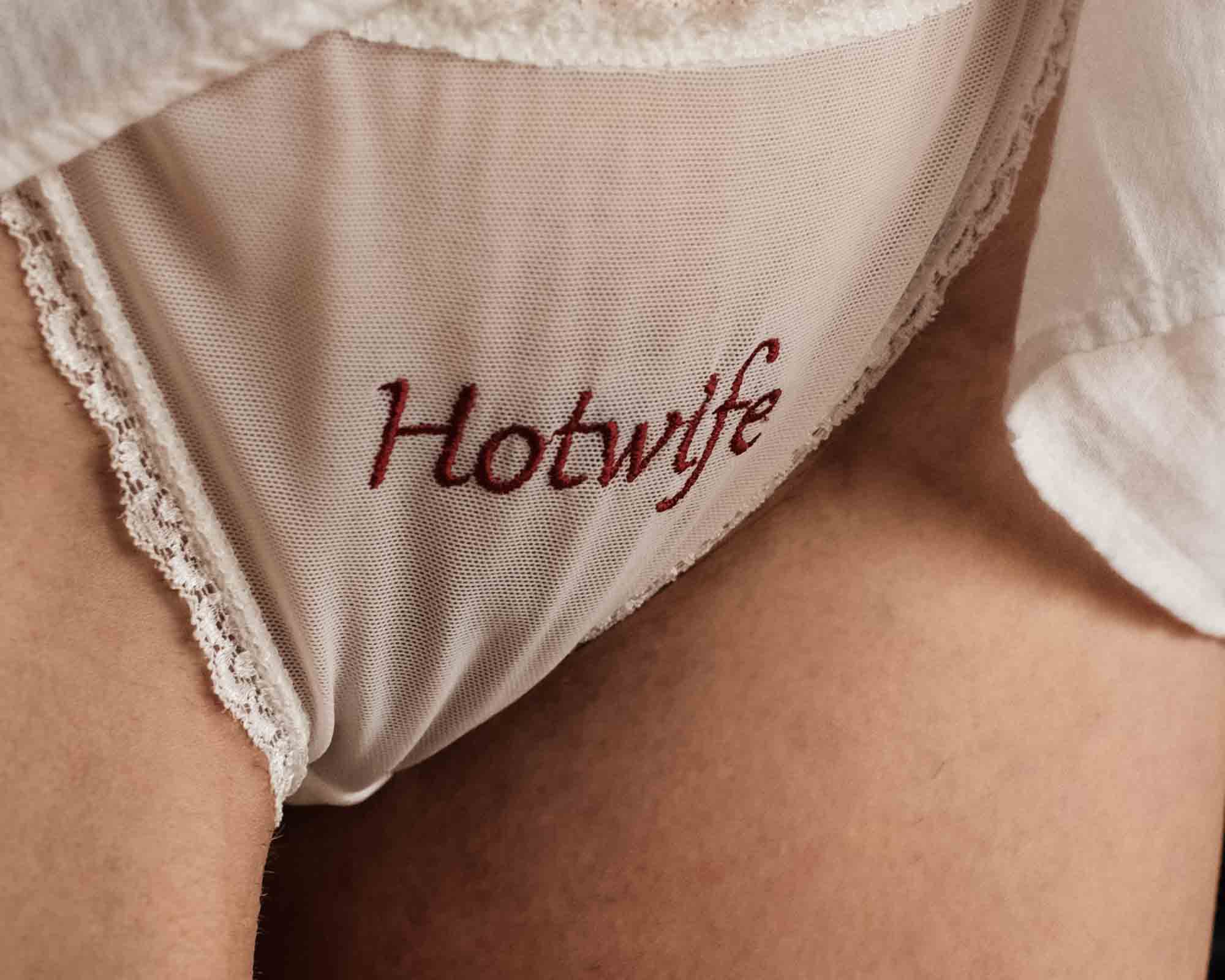 Semi-sheer mesh panties with side ties and “hotwife” embroidery.